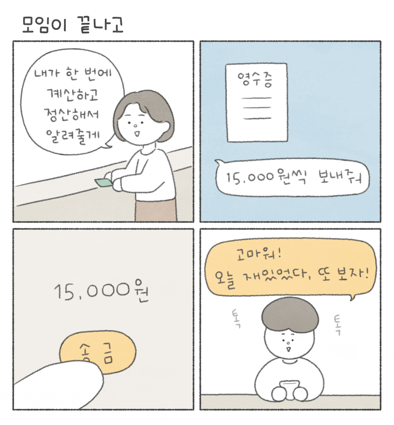 일단 각출의 바탕에는 누구에게도 부담을 몰아주지 않겠다는 마음이 깔려있다. 한 명이 많이 내면 선의일지 언정 버겁기 마련이고, 그런 일이 쌓이다 보면 만남이 꺼려질 수도 있다. 따라서 계속 보고 싶다는 무언의 애정을 1/N씩 나눠 가지는 것이다.